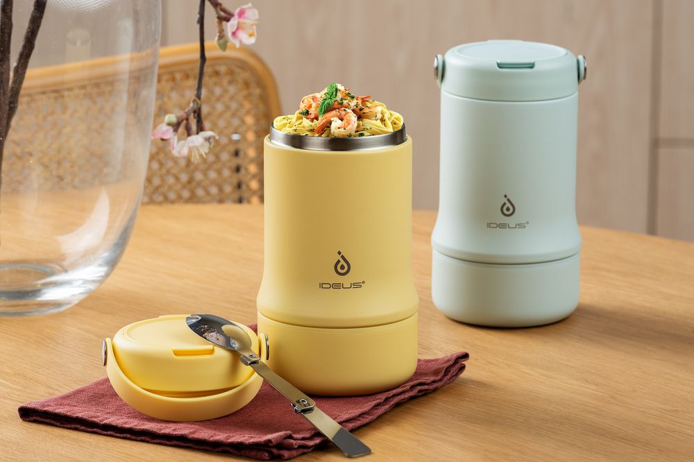 Tabenodo — универсальный многофункциональный термос для работы, школы, похода и путешествия. В компактном корпусе разместились ложка, тарелка и емкость для любимого блюда. Матовая поверхность приятна на ощупь, а силиконовая ручка удобна для переноски.