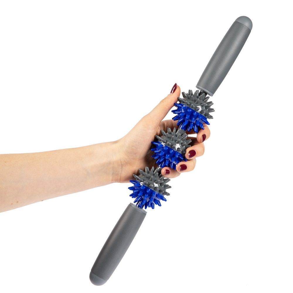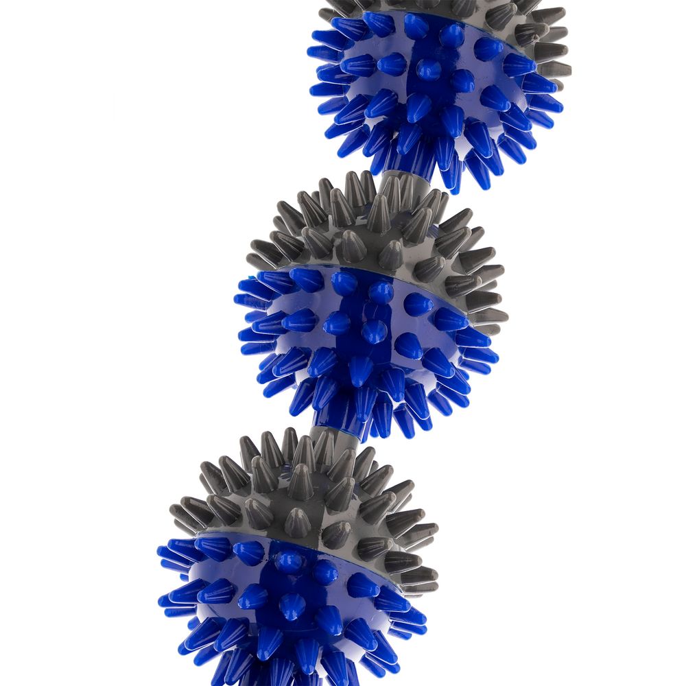 Массажер изготовлен из твердого пластика и стальной основы, на которую закреплены рукоятки с 3 пластиковыми массажными мячиками со сглаженными шипами. Рукоятки массажера с мягким покрытием не выскальзывают и удобно лежат в руках.