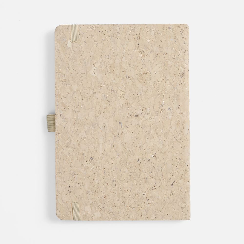 Блокнот с твердой обложкой из из натуральной окрашенной пробки, дополнен петлей-резинкой для ручки, ляссе и резинкой в цвет обложки.