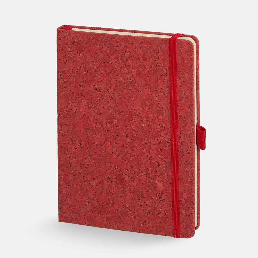 Блокнот с твердой обложкой из из натуральной окрашенной пробки, дополнен петлей-резинкой для ручки, ляссе и резинкой в цвет обложки.